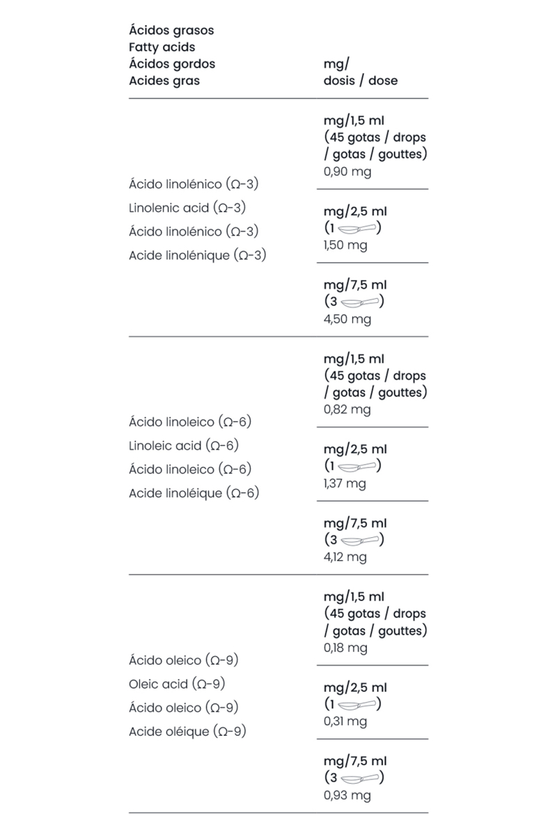 Take 1.5-2.5 ml three times a day (see equivalence in drops in the table of content). For children older than 3 years old, it is recommended the stated minimum dose. Virgin raspberry seed oil has been traditionally used as a base for preparing cosmetics. Contains a 2.5 ml measuring spoon.