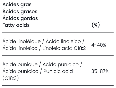Pomegranate virgin oil has reparative, antioxidant, and skin-regenerating properties. Its high antioxidant content helps combat photoaging. Rich in punicic acid, it forms a protective film on the skin that reduces transepidermal water loss (TEWL), helping to maintain optimal hydration levels in the epidermis. It also enhances the structure of the skin’s natural intercellular cement, providing a natural anti-aging effect.