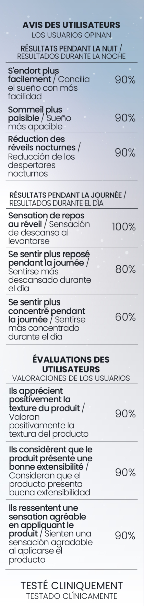 Aplicar por la noche, antes de acostarse. Pulverizar 3 dosificaciones sobre cada lado de la almohada. A continuación, pulverizar 4 veces alrededor de la cabeza, manteniendo el frasco a una distancia adecuada. Dejar que el aroma se disperse suavemente en el ambiente, inspirando profundamente durante unos instantes. Finalmente, acostarse y disfrutar de un descanso reparador.